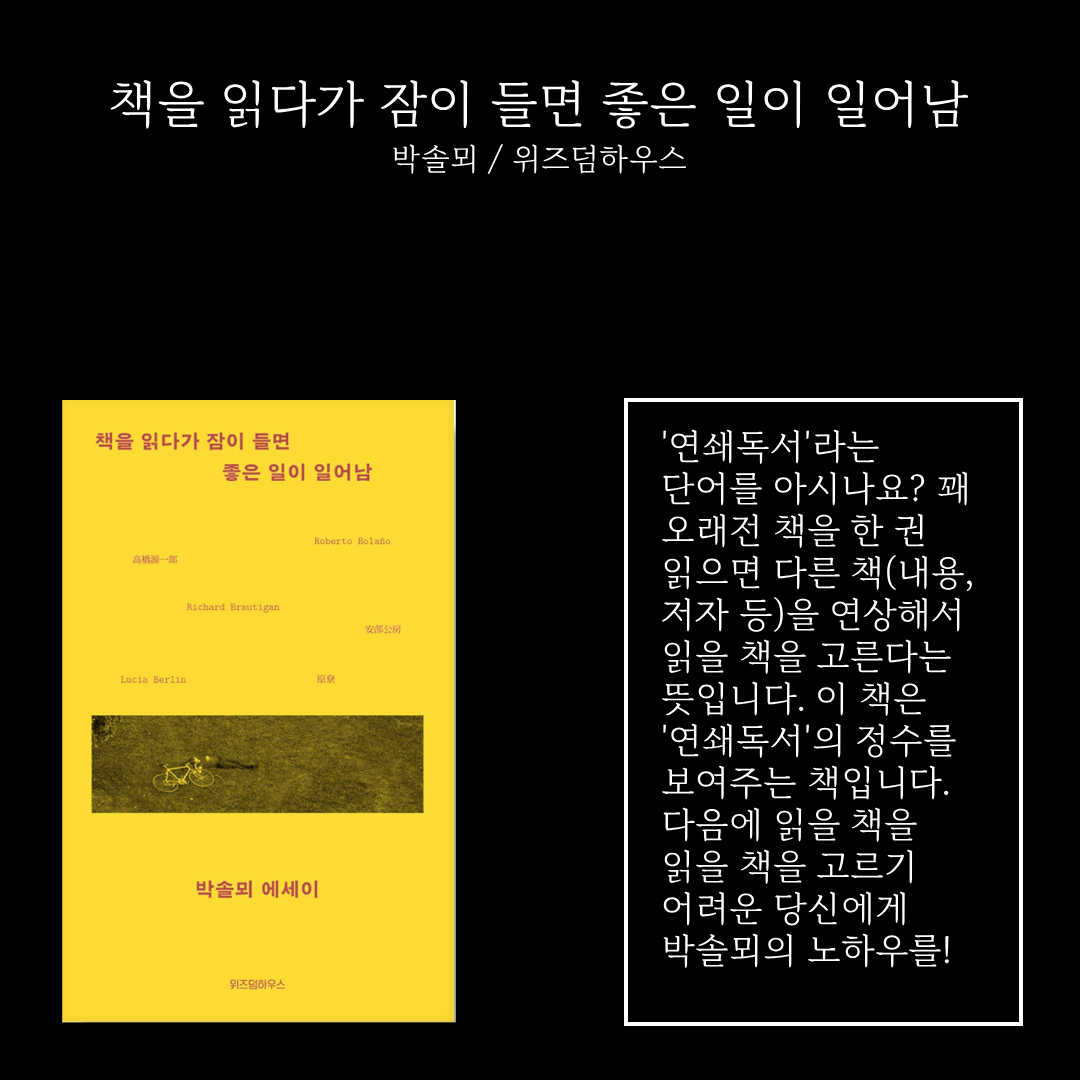 박솔뫼는 소설을 쓰기 전에 여러 번 읽어본 소설을 다시 찾아 읽기도 한다고 합니다. 소설을 쓰기 위한 힘을 얻기 위해서요.(5쪽) 여러 번 읽어본 소설을 계속 찾는 이유는 무엇일까요? <책을 읽다가 잠이 들면 좋은 일이 일어남>을 끝까지 읽으면 한 권의 책에 대한 박솔뫼의 감상 변화를 파악할 수 있습니다. 이런 현상은 당연히 생길 수밖에 없습니다. 책 한 권을 처음 읽을 때와 다시 읽을 때 달라지는 요소가 많기 때문입니다. 사회가 변화합니다. 주위 사람들이 변화합니다. 온오프라인을 통해 접하는 내용이 변화합니다. 다양한 인풋을 통해 사고방식도 변화합니다. 자연스럽게 세상을 바라보는 관점이 바뀝니다. 바뀌지 않는 지점도 있겠지요. 당연히 책 한 권을 여러 번 읽으면 낯선 지점이 눈에 들어오기도 합니다. 즉, 독서는 재회할 때마다 바뀐 자신을 느끼게 해 주는 매개체인 셈입니다. 이런 독서의 매력을 알고 싶다면 <책을 읽다가 잠이 들면 좋은 일이 일어남>을 추천합니다.