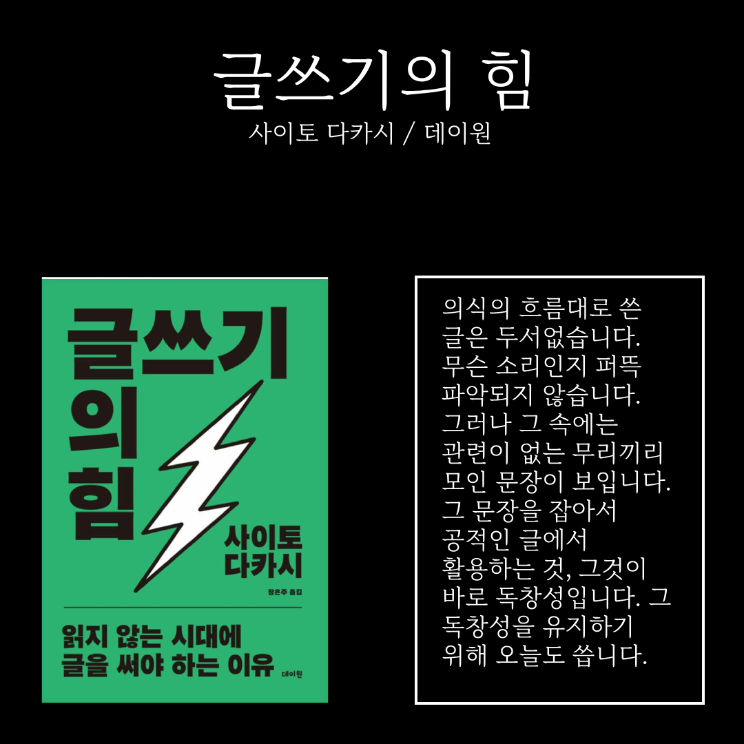 이 감상문을 ‘개요 짜기’, ‘독서법’, ‘일기’ 이 세 가지 키워드를 토대로 글을 썼습니다. 이어지는 듯하면서도 어색한 부분이 군데군데 남아 있습니다. 이것을 하나하나의 키 콘셉트에 그만큼 오리지널리티가 없어도 연결 형태에 드러나는 독창성이라고 표현합니다.(168쪽) 여러분은 이 글에서 어떤 독창성을 찾을 수 있었나요? 저는 찾을 수 없었습니다. 뻔한 소리를 적으면서 독창성을 갖춘 글을 쓰고 싶습니다.