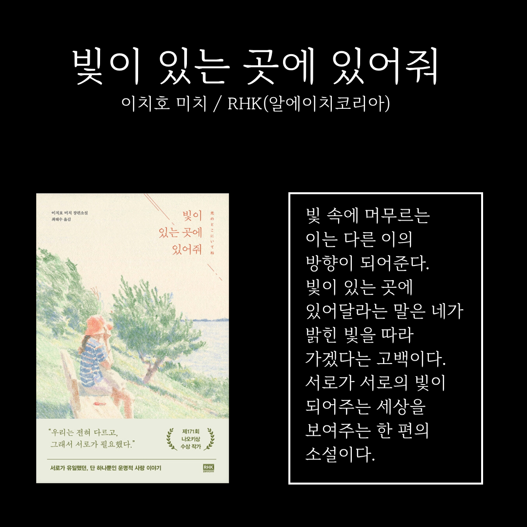 자신이 머무를 빛을 찾기 위해 노력하는 사람에게 빛나는 방향이 되어줄 다른 이의 빛이 존재한다는 사실을 깨닫게 하는 소설입니다. 빛 속에 머무르지 못해서 불안한 사람에게 권하고 싶은 소설입니다.