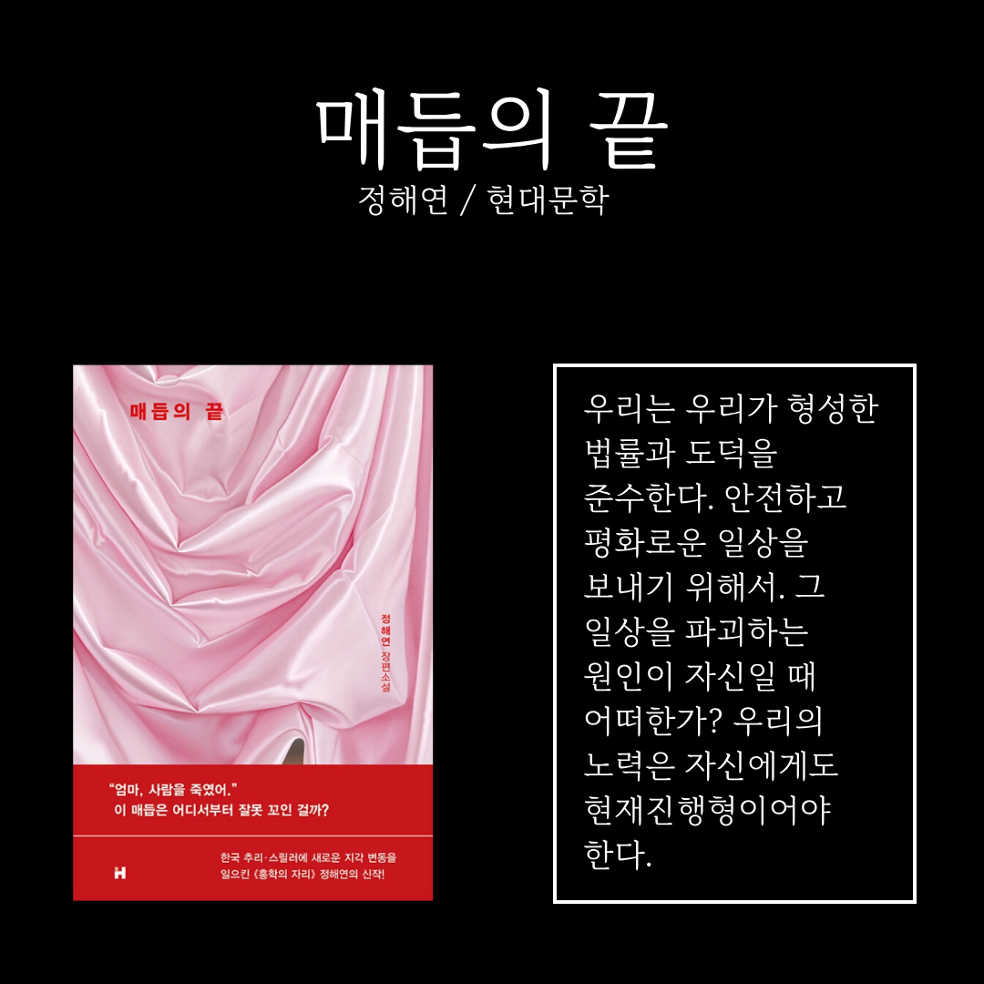피해자와 용의자의 관계가 얽히고설킬수록 죄의 무게를 가늠하기 어렵습니다. 수사 과정에서 사적 감정이 작용하지 않는다는 보장도 없습니다. 그래도 우리가 형성한 법률과 도덕을 지키려는 노력이 아직은 살 만한 세상이라고 느끼게 합니다. <매듭의 끝>은 이 노력의 과정을 보여주지 않습니다. 독자에게 당신이라면 어떻게 노력할 것인지 묻습니다. 우리의 노력은 현재진행형이기 때문입니다. 자, 당신은 어떤 노력을 하고 있나요?