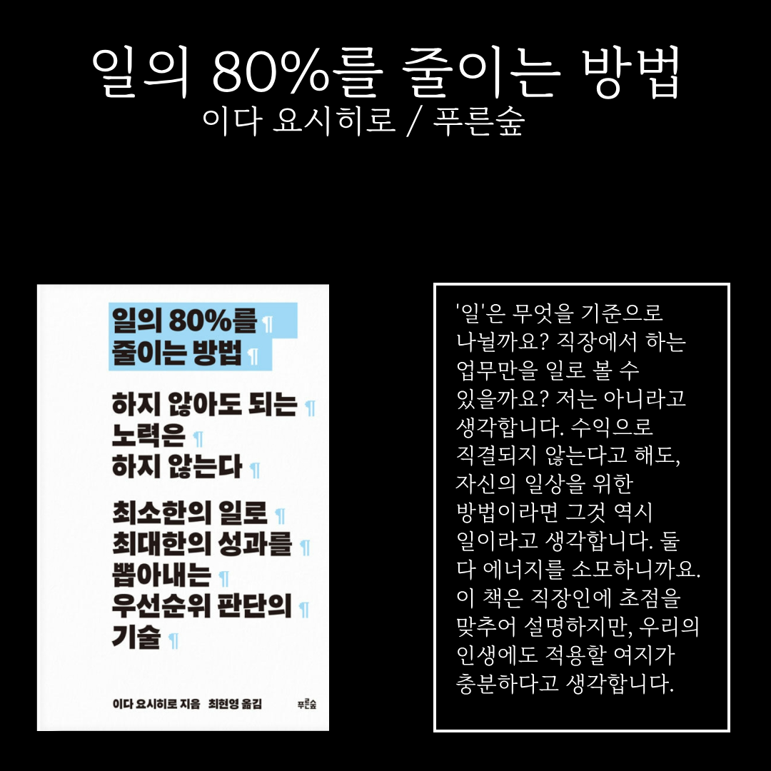 위의 방법들을 개인의 생활에도 적용하면 좋겠다고 생각합니다. 특히 주목하는 방법은 큰 목표를 작은 목표로 역산하기입니다. 우리는 직장에서 소비하는 시간이 깁니다. 자신만의 시간을 보내기 어렵지요. 업무 처리도 잘하고 싶지만, 풍요로운 시간을 보내고도 싶습니다. 그럴 때마다 시간이 부족하다는 현실과 마주합니다. 에너지를 모두 쏟고 온 퇴근한 뒤의 시간에는 마냥 쉬고 싶습니다. 자율적으로 관리할 수 있는 휴일에는 일하는 동안 마비됐던 신체 감각이 예민해져서 고된 느낌을 받습니다. 하고 싶었던 독서, 여행, 일기쓰기 같은 취미가 귀찮아질 따름입니다. 먹고 살기 위해 필요한 시간이 풍요로운 생활을 위한 시간을 줄어들게 만드는 셈입니다.