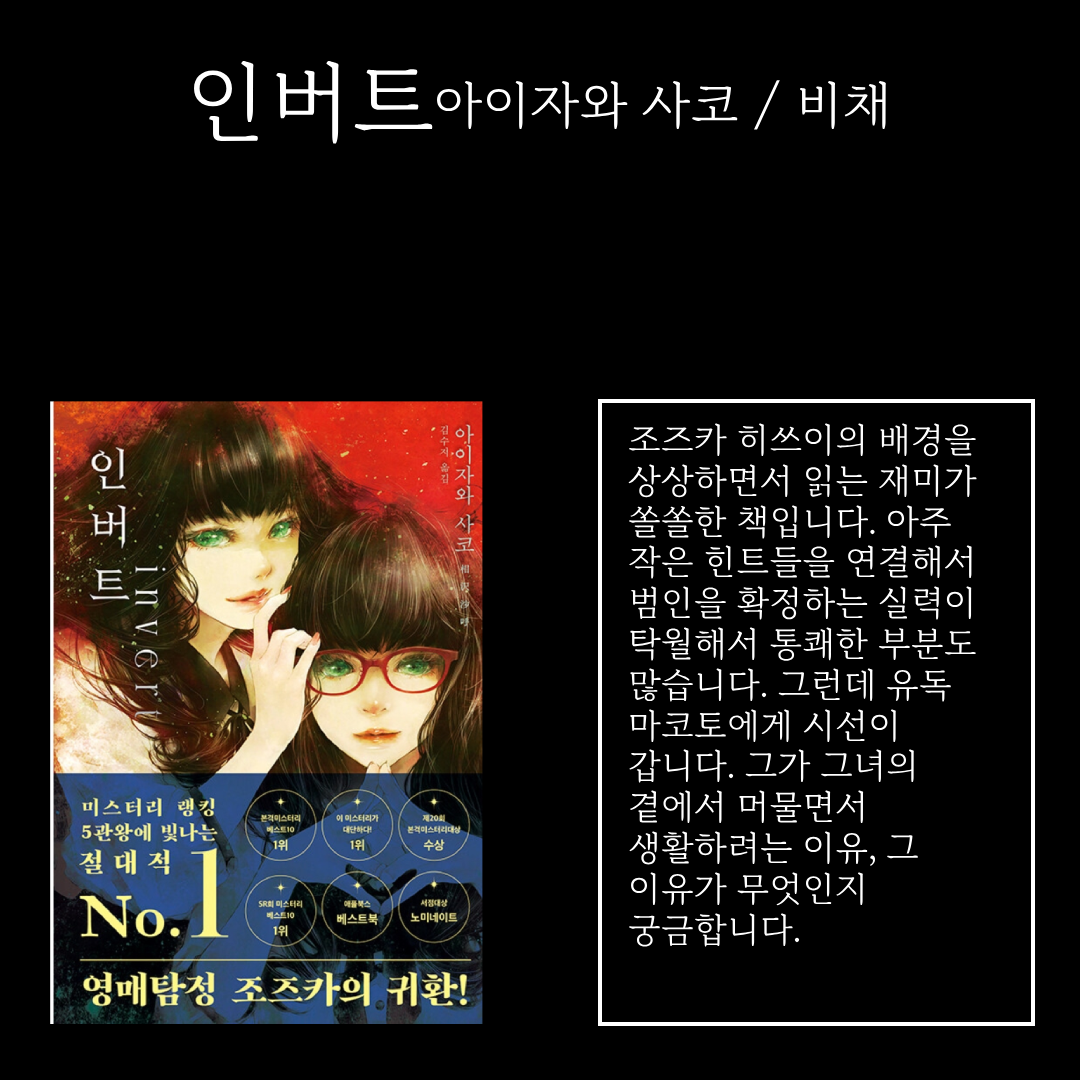 <영매탐정 조즈카>를 읽을 때는 책 속의 이야기인데, 뭐. 이렇게 생각했습니다. 그런데 <인버트>를 다 읽은 뒤, 떠오른 등장인물은 조즈카 히쓰이가 아니라 마코토였습니다. 마코토는 늘 조즈카 히쓰이에 대해 추측합니다. 늘 조즈카 히쓰이와의 거리감을 잽니다. 이 관계가 옳은 관계인지 옳지 않은 관계인지 의문을 품습니다. 그 고민의 결과, 자신이 조즈카 히쓰이의 계획 속의 말일지도 모른다는 의심을 품습니다. 그러나 비범한 조즈카 히쓰이의 추리력과 사이다 같은 행보에 이것이 그녀만의 정의라면 자신은 따른다고 생각합니다. 또한, 언젠가는 히스이의 모든 걸 이해하고 지지해줄 수 있는 사람이 나타나면 좋겠다고(475p) 생각합니다. 조즈카 히쓰이에 대해 끊임없이 의심하면서 아무런 행동을 하지 않습니다. <인버트> 후속 작품이 일본에서는 출판됐습니다(아마존 재팬 검색 결과). 저는 아직 읽지 못했으니, 제 바람을 담습니다. 조즈카 히쓰이와 마코토가 미리 사전에 우리가 물리치자고 합의한 공조 관계이기를 간절히 바랍니다. 그것이 아니라면 그냥 재미있다고 넘기지 못하겠습니다.