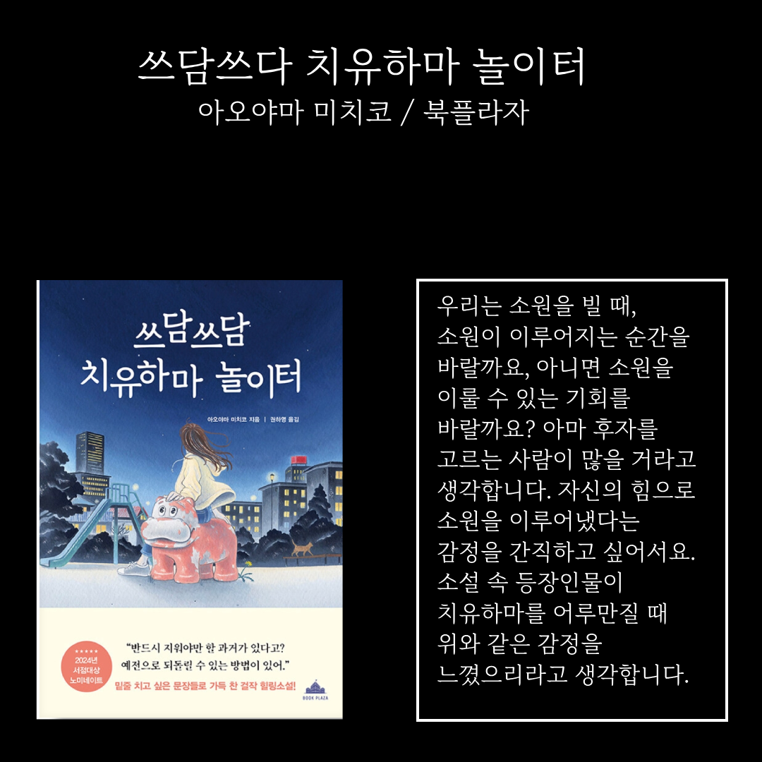 아오야마 미치코의 작품은 서점대상 후보에 자주 오릅니다. 일본에서 실시되는 서점대상은 전국의 서점 직원들이 가장 팔고 싶은 작품을 고르는 상입니다. 일반인과 가장 가까운 입장인 사람들이 뽑는 상입니다. 그래서일까요? 일상생활에 잔잔한 울림을 주는 책이 많습니다. 매년 서점대상 후보로 거론된다는 뜻은 아오야마 미치코의 소설이 일상생활에 깨달음을 준다는 뜻이겠지요. 특히 하나의 매개체를 통해서 과거와 현재를 넘나들며 일상생활의 고민을 극복하는 전개방식이 꽤 훌륭합니다. <쓰담쓰담 치유하마 놀이터>에서는 놀이터에 있는 하마 조형물을 매개체로 삼아 이야기가 펼쳐집니다.