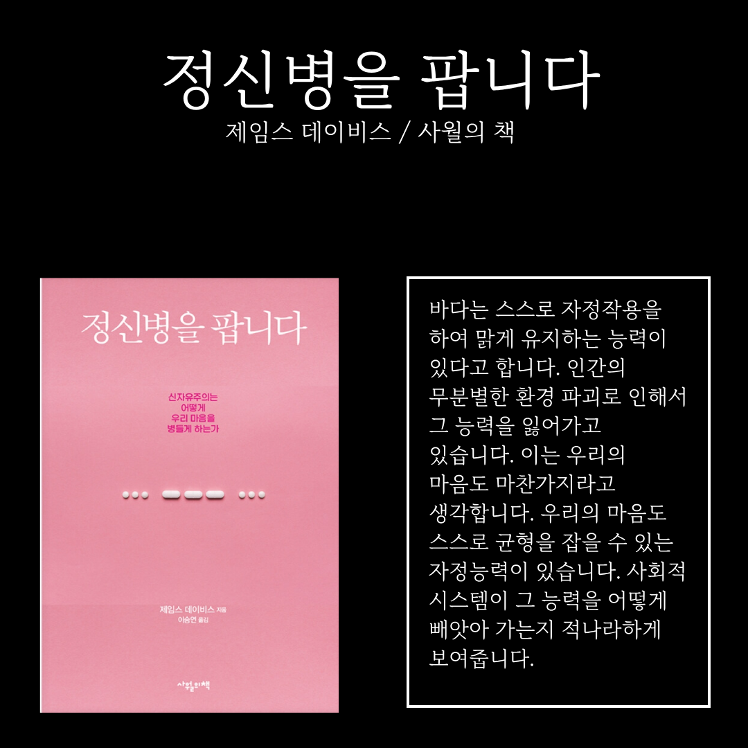 <정신병을 팝니다> 제목이 흥미롭습니다. ‘판다’라는 행위에는 이익을 보는 누군가가 있다는 뜻입니다. 어떤 시스템 속에서 정신병을 팔아서 이익을 보는 걸까요? 생각해 보면 요즘처럼 교양 심리학 도서가 활발하게 출간되는 시대는 없습니다. 특히, 뇌 과학과 연관을 짓는 도서가 많습니다. 뇌에서 분비되는 신경전달물질의 양에 따라 마음 상태가 바뀐다고 합니다. 심지어 어떤 책에서는 뇌의 신경전달물질을 조절할 수 있는 약을 소개하기도 합니다. 어쩌면 현 시대는 마음의 문제를 약물로 치료할 수 있다고 사람들을 설득하는 중입니다. 그런데 과연 마음의 문제를 개인에게만 달려 있다고 볼 수 있을까요? 개인을 둘러싼 환경에는 문제가 없는 걸까요? <정신병을 팝니다>는 현 시대에 팽배한 물질주의가 사람의 마음의 상품화를 시도하고 있다고 경고합니다.